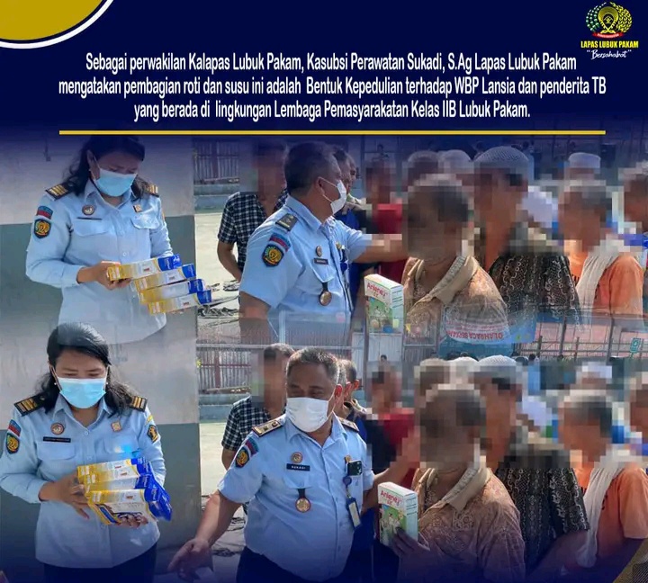 Sebagai perwakilan Kalapas Lubuk Pakam, Kasubsi Perawatan Sukadi, S.Ag Lapas Lubuk Pakam mengatakan pembagian roti dan susu ini adalah Bentuk Kepedulian terhadap WBP Lansia dan penderita TB yang berada di lingkungan Lembaga Pemasyarakatan Kelas IIB Lubuk Pakam.