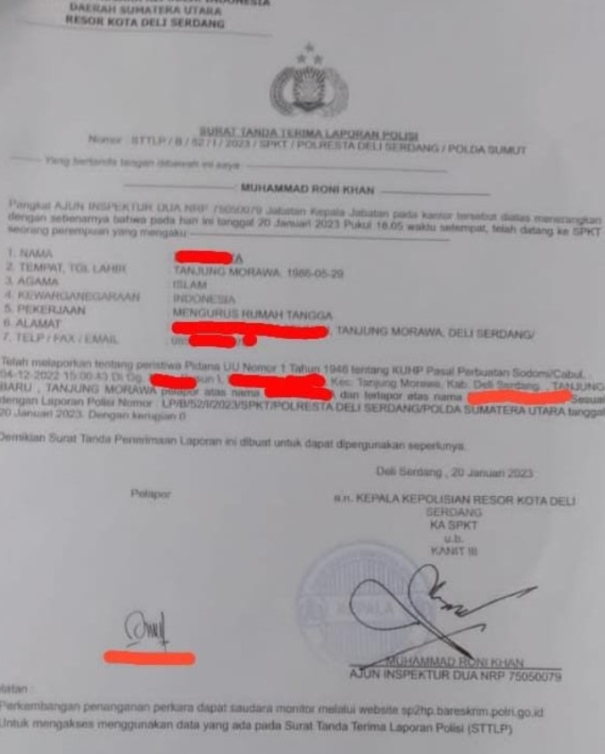 Dengan Nomor Laporan STTLP/B/52/l/2023/SPKT/POLRESTA DELI SERDANG/POLDA SUMUT , pertanggal 20 Januari 2023 Pidana UU Nomor 1 Tahun 1946 Tentang KUHP Pasal Perbuatan Sodomi atau cabul.